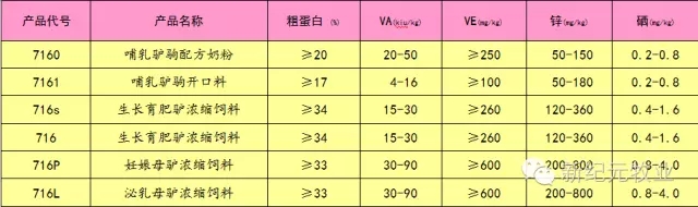 1.哺乳驴驹配方奶粉驴代乳粉(7160):模拟驴乳营养,精选原料,优化配方,不仅蛋白质、脂肪、碳水化合物等主要营养素含量和比例与天然驴乳相近,而且强化了氨基酸、矿物质、维生素、益生素、益生元的添加,产品的营养成分稳定,保健性能优于母乳,使用效果确切。本料主要适用于以下场合:①母驴死亡或无乳时,可用本料完全代替母乳,确保幼驹的成活;② 母乳不足时,补充本料可提高幼驹的生长速度,提高断奶体重,为后来的生长和性能发挥奠定基础;③ 母驴用于挤奶出售时,可用本料部分或全部代替母乳,从而可缩短幼驹每天哺乳时间和哺乳周期,增加可供出售的商品奶数量,提高农牧民收入。