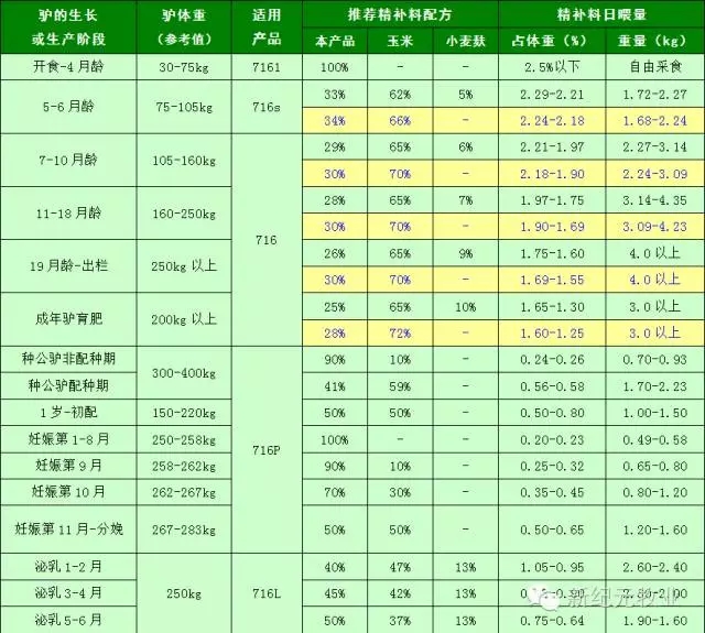 2.为实现精准饲养,生长育肥驴应按年龄和体重分群,种公驴和母驴按生产阶段分群,选择对应的饲料产品并按相应的推荐饲喂方案使用。这样做,既能保证更大限度满足驴的各种营养需要,发挥驴的生长和生产潜能,又能保证成本更低,效益更佳。所以,使用本公司的各种驴饲料时都不可随意更改饲喂方案,不可与其他厂家的饲料混用,不必添加任何添加剂,以免造成浪费或引起不良反应。如需调整饲喂方案,用户可向本公司销售人员提出,并说明所用的饲料原料情况,必要时提供饲料原料样品交由本公司进行检测,以便合理调整饲喂方案。