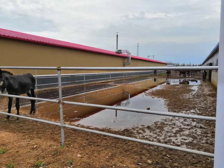 驴的运动场要有足够的面积,给驴一个充分活动的空间。同时运动场地面要有一定的倾斜角度,保证夏季强降雨时雨水的顺畅排出。下图便是运动场内积水的情景,提醒养殖者们注意。